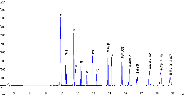 16种多环芳芬烃规范化品高效液相色谱图以内: